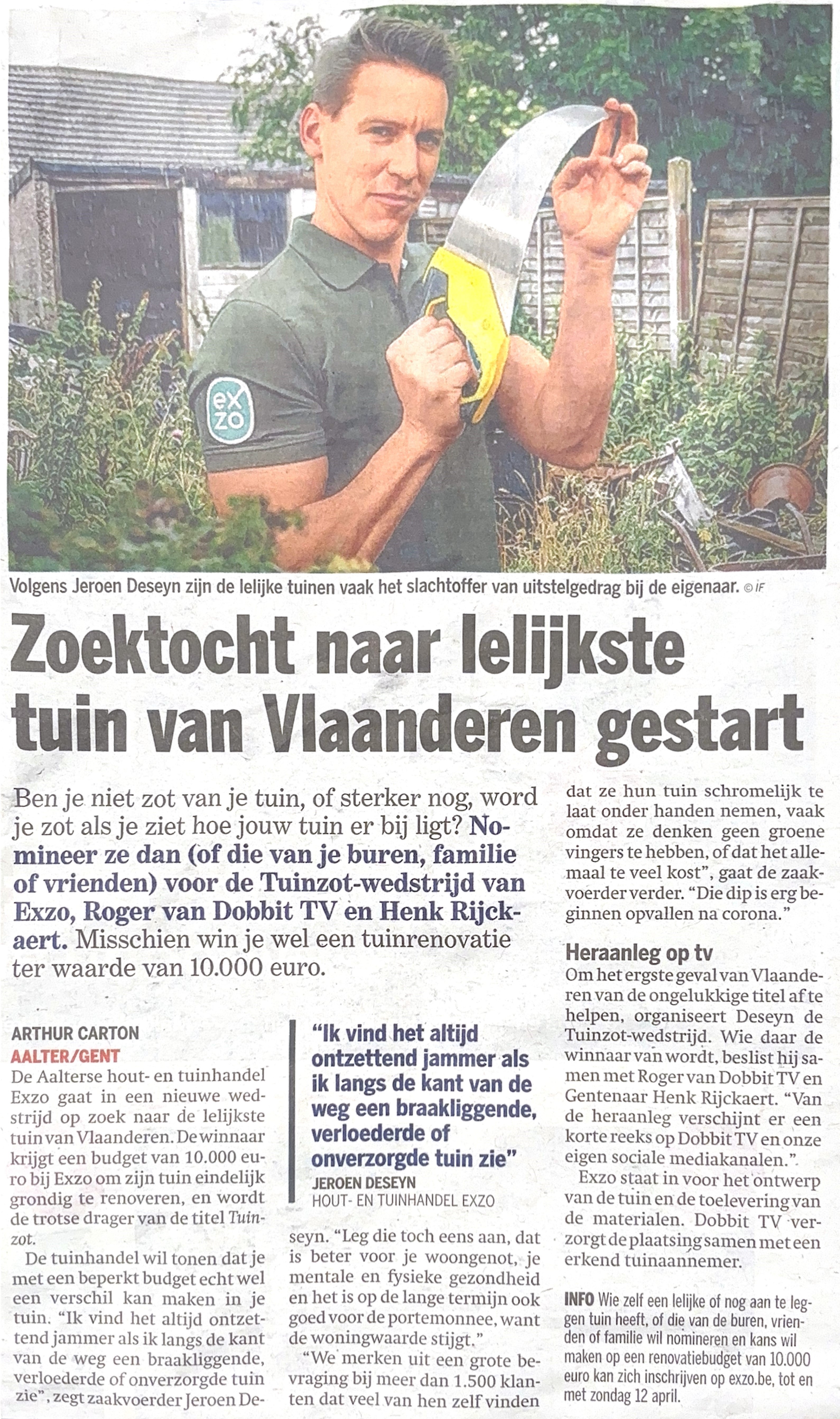 EXZO gaat op zoek naar de lelijkste tuin van Vlaanderen en beloont de winnaar met een tuin make-over ter waarde van €10.000. Zaakvoerder Jeroen Deseyn maakt die beslissing met Roger van Dobbit TV en fervent doe-het-zelver en BV Henk Rijckaert.