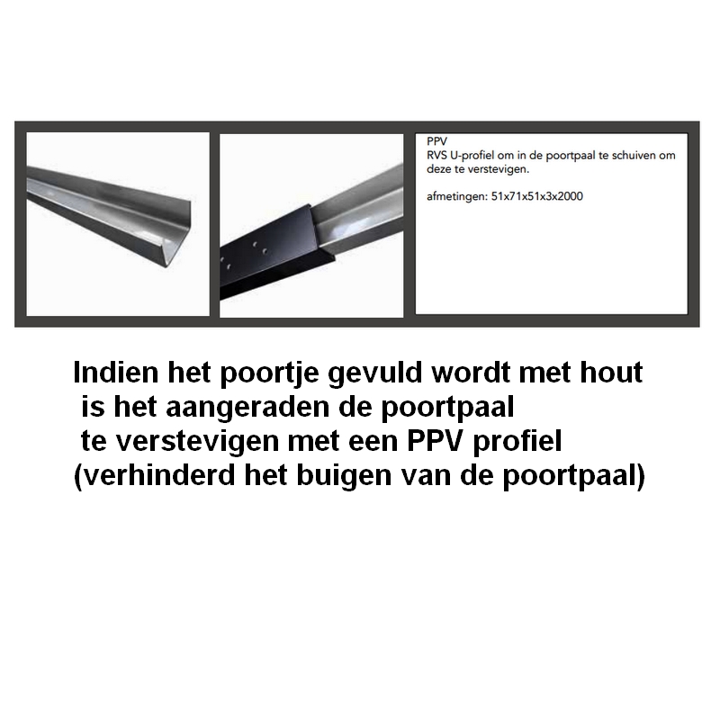 Indien het poortje gevuld wordt met hout is het aangeraden om de poortpaal (scharnierkant PP2) te verstevigen met een PPV profiel (verhinderd het buigen van de poortpaal). Dit profiel schuif je eenvoudig in de poortpaal.