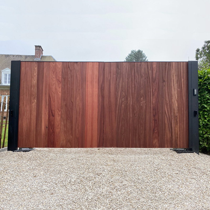 Deze elegante, strakke geautomatiseerde dubbele draaipoort met metalen frame en houten afwerking is de perfecte match voor wie op zoek is naar een kwaliteitsvolle en duurzame toegangspoort. Deze dubbele draaipoort is makkelijk te installeren en wordt geleverd met al het nodige voor een volledige automatisatie. Bovendien past deze poort met padouk planchetten zowel bij een landelijke- als moderne stijl.