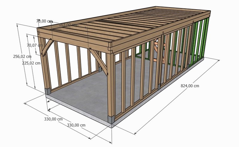 De totale constructie, bestaande uit zowel een berging als een overkapping, heeft een afmeting van 3,30 meter breed bij 8,24 meter lang. De berging zelf heeft een skeletdiepte van 2,24 meter, terwijl de overkapping een diepte van 6 meter beslaat. De standaard doorloophoogte bedraagt circa 200 cm, maar kan worden verhoogd tot 225 cm indien de constructie op optionele sokkels wordt geplaatst.
