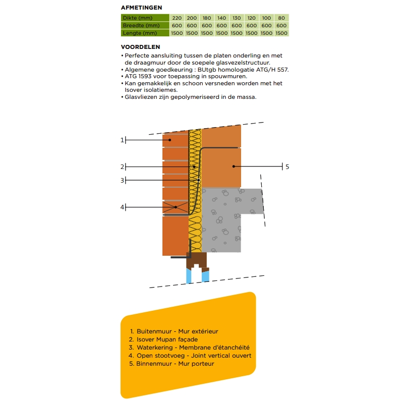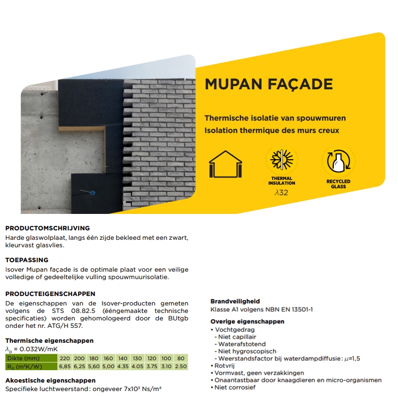 Met een uiterst lage lambda-waarde van 0,032 W/mK biedt de Mupan Façade een superieure thermische weerstand. Zoals alle glaswol van Isover is dit product ecologisch verantwoord; het bestaat grotendeels uit gerecycleerd glas en is volledig onbrandbaar (Euro-brandklasse A1).