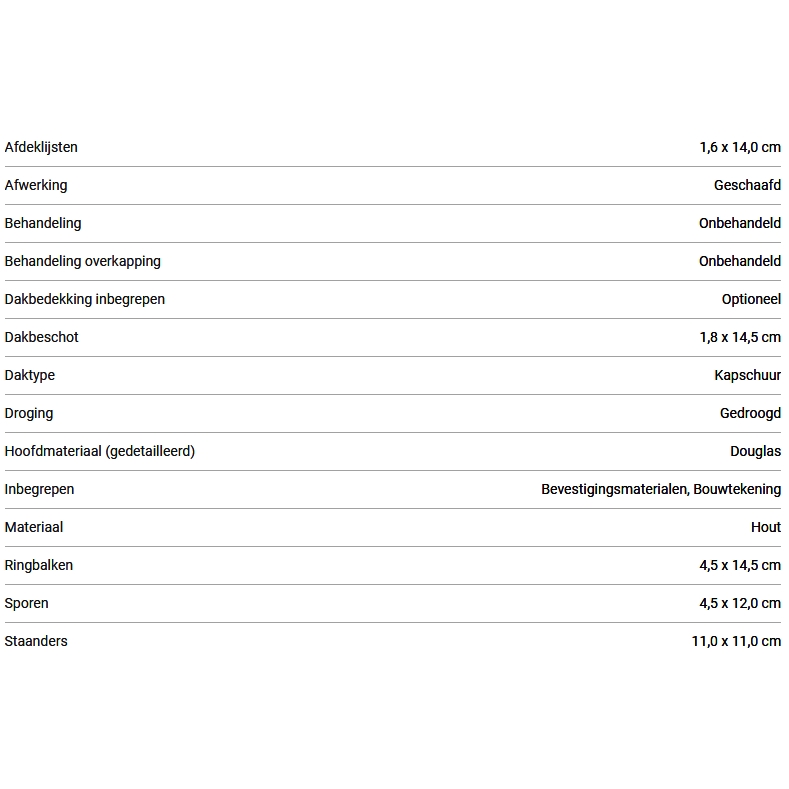 Dit zeer complete Lariks Douglas kapschuur bouwpakket bestaat uit 11 x 11 cm geschaafde staanders, schoren, 4.5 x 12 cm balken, 18 mm dikte veer en groef dakplanken inclusief Nederlandse bouwtekening en bevestigingsmateriaal.