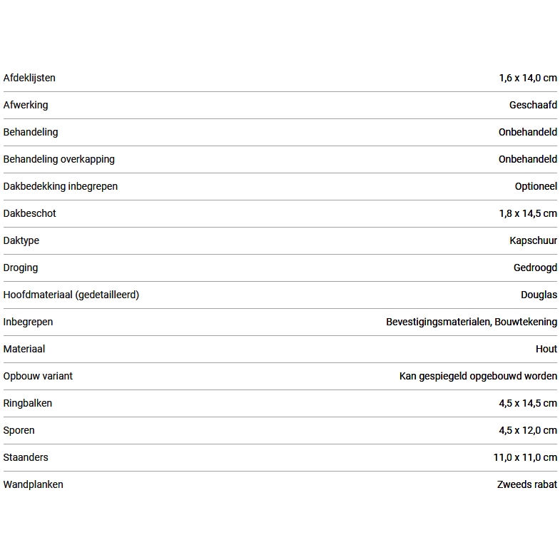 Dit zeer complete Lariks Douglas kapschuur bouwpakket bestaat uit voorgeboorde en voorgezaagde 11 x 11 cm geschaafde staanders, schoren, 4.5 x 12 cm balken, 18 mm dikte veer en groef dakplanken inclusief Nederlandse bouwtekening en bevestigingsmateriaal.