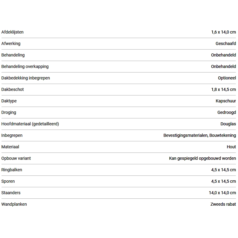 Dit zeer complete brede Lariks Douglas kapschuur bouwpakket bestaat uit voorgeboorde en voorgezaagde 14 x 14 cm geschaafde staanders, schoren, 4.5 x 14.5 cm balken, 18 mm dikte veer en groef dakplanken inclusief Nederlandse bouwtekening en bevestigingsmateriaal.