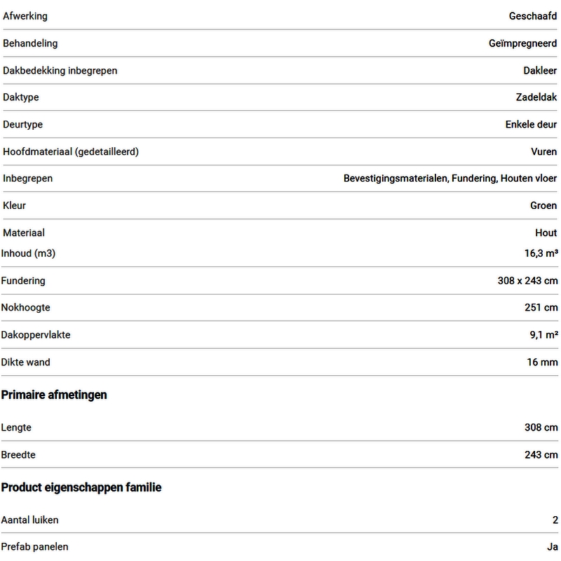 Inclusief: Bevestigingsmaterialen, roofing, houten vloer, fundering, twee te openen luiken