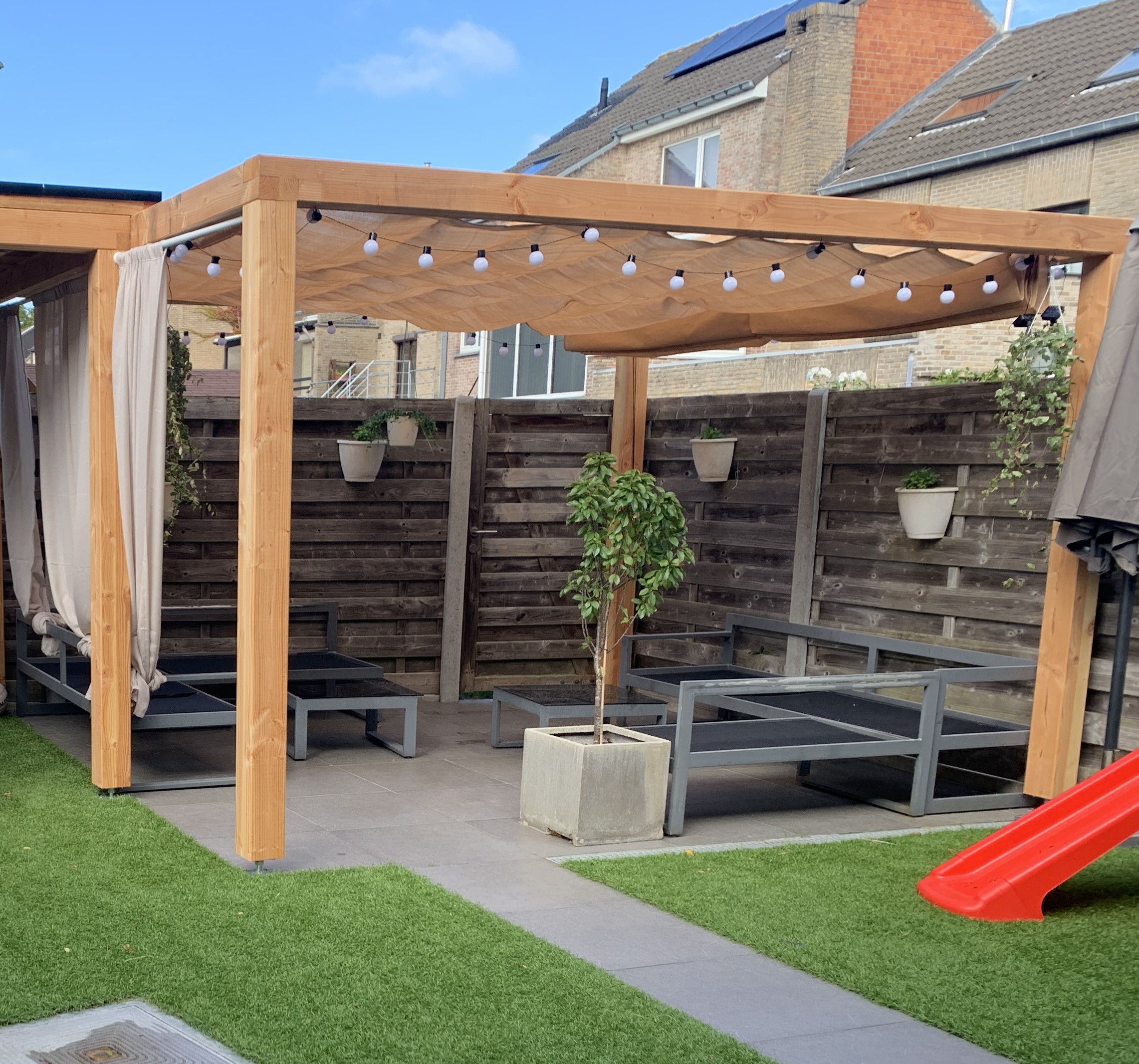 In dit doe-het-zelfpakket vind je alle materialen om zelf je pergola met schuifzeil te bouwen.