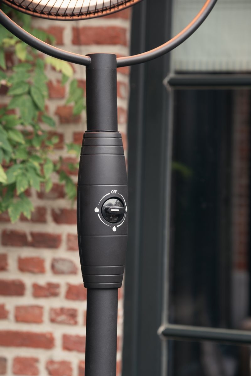 De terrasverwarmer beschikt over drie instelbare vermogensstanden van 900, 1200 en 2100 watt, zodat de warmte eenvoudig kan worden aangepast aan de buitentemperatuur en het gewenste comfortniveau.