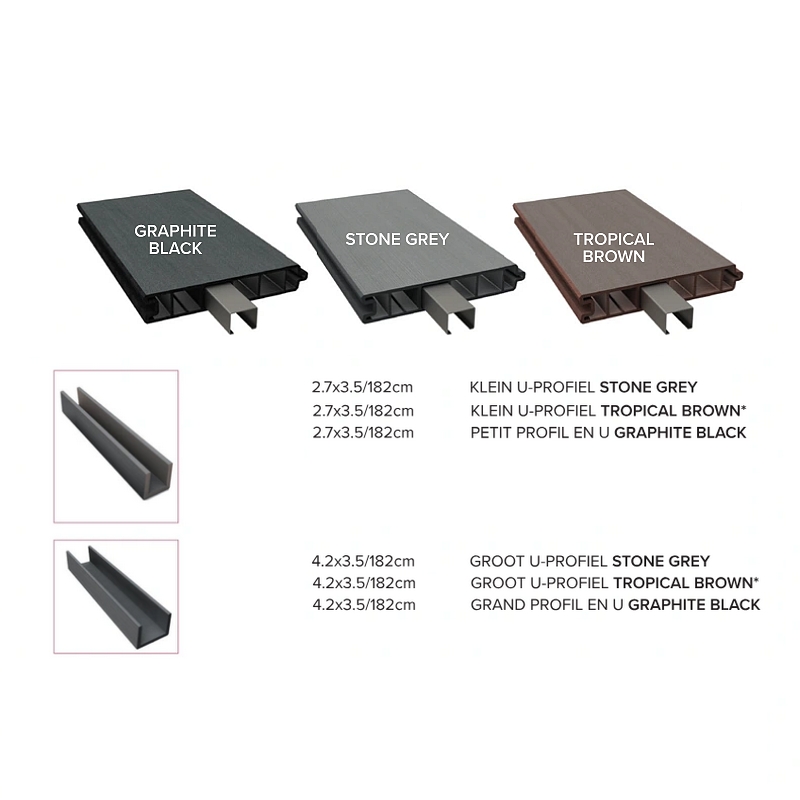 Daarnaast hebben we een klein en een groot U-profiel in het assortiment. Een klein U-profiel dient voor de composietplanken en zijn 180 centimeter lang. De kleur ‘Tropical brown’ is een uitzondering, want die hebben we ook in een extra lange lengte van 200 centimeter.