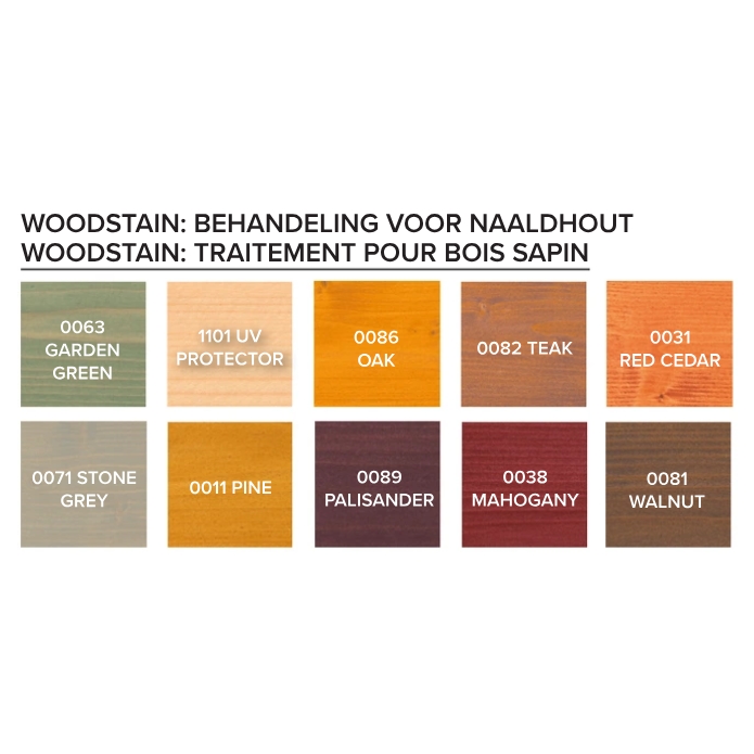 Wood stain is verkrijgbaar in garden green, UV-protector, oak, teak, red cedar, stone grey, pine, pallisander, mahogany en walnut.