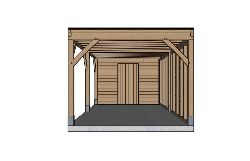 Het gebinte van de overkapping bestaat uit massieve, geschaafde en voorgefreesde eiken balken. Hierdoor past alles perfect in elkaar en kan je het vlot en nauwkeurig monteren.