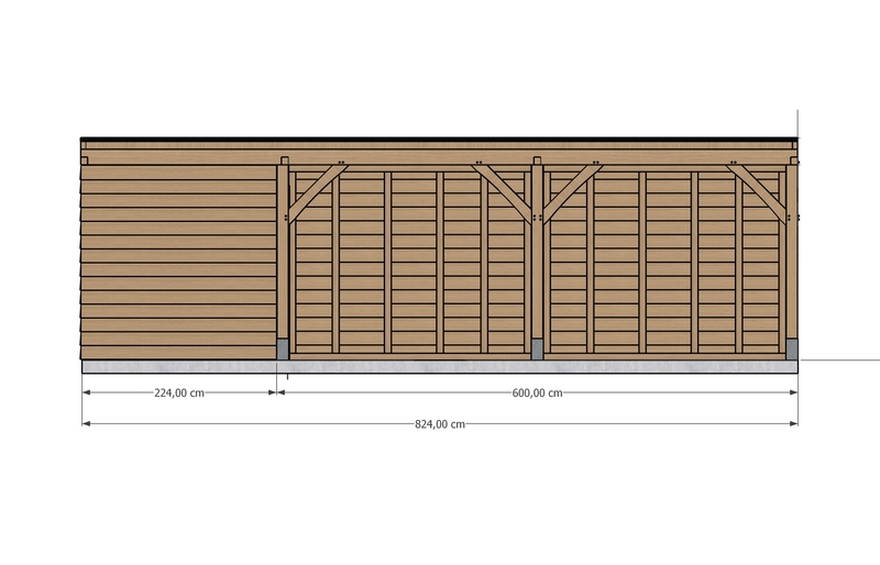 Het bijgebouw Catus is een complete zelf-bouw-set van een carport met geïntegreerde berging. Alle onderdelen voor de basisconstructie en volledige afwerking zijn inbegrepen. Hier is één zijwand van de overkapping bekleed met eiken sidings (22 × 155 mm), wat de constructie meteen een gesloten en afgewerkte look geeft.