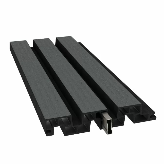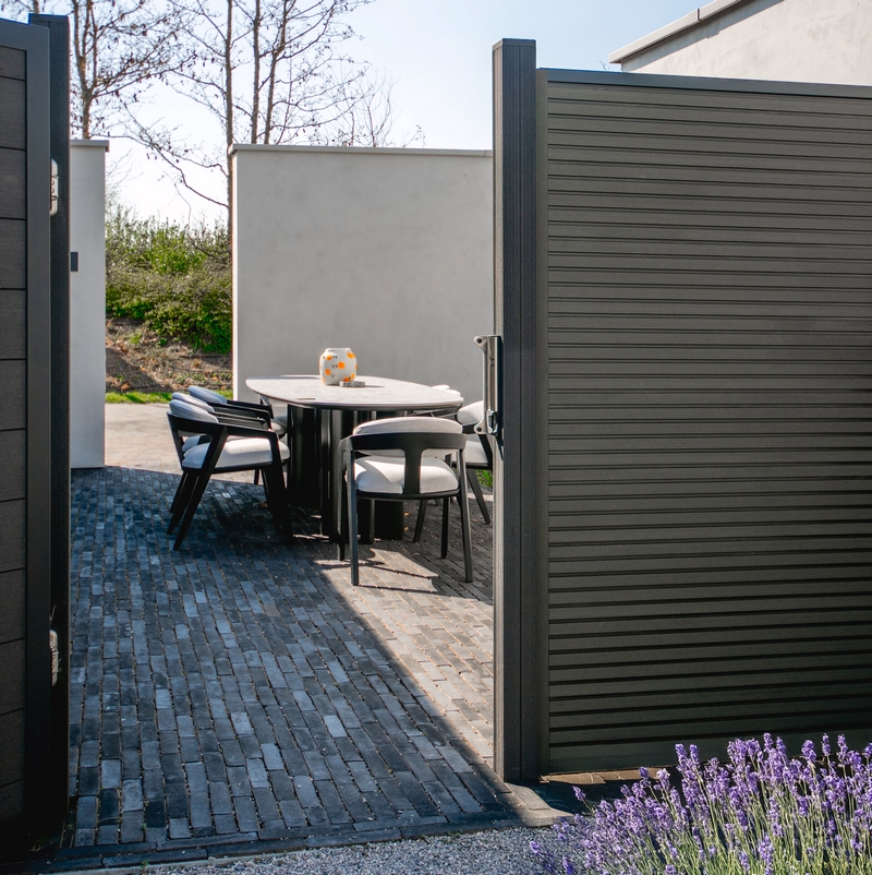 De schuttingen zijn beschikbaar in drie mogelijke kleuren: tropical brown, riverstone grey en graphite black.