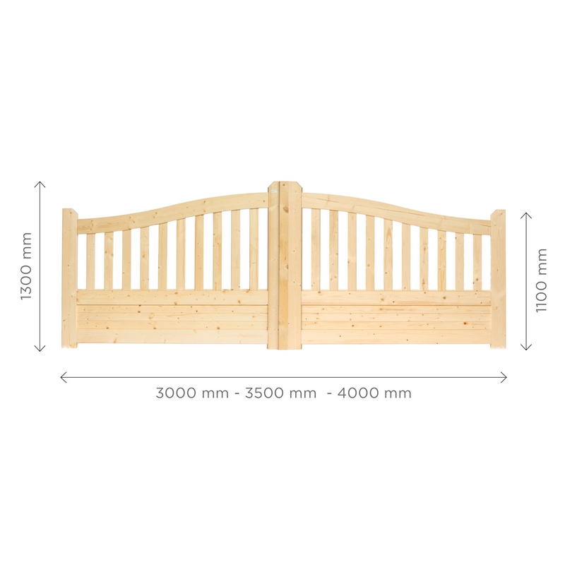 Deze dubbele houten poorten uit gecertificeerd grenenhout vormen een duurzame en esthetische oplossing voor elke tuin of oprit. De poorten zijn beschikbaar in zowel geïmpregneerde als niet-geïmpregneerde uitvoeringen.