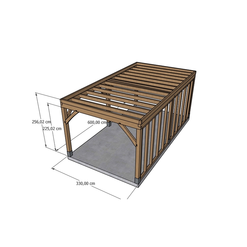 Het Model voorzien voor de afwerking met zijwand heeft een afmeting van 3,3 x 6 meter en is voorzien van een plat dak zonder oversteek. De doorloophoogte is ongeveer 200 cm (of 225 cm bij gebruik van sokkels). Dit gebinte is exclusief arduinen sokkels.