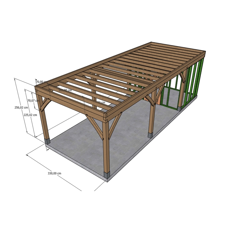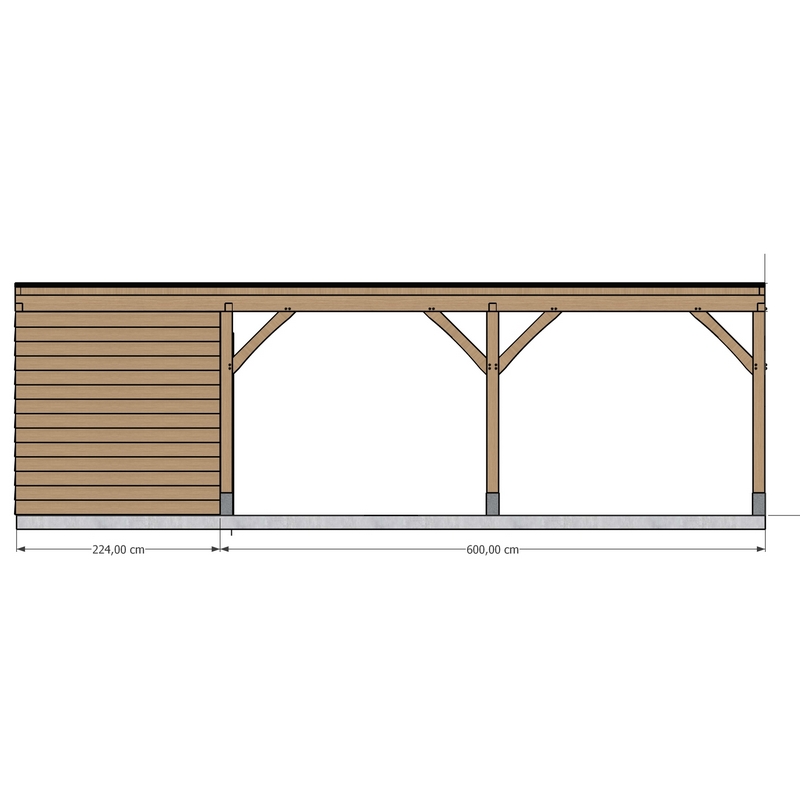 Dit volledig op maat verkrijgbare eiken gebinte met geïntegreerde berging wordt geleverd als bouwpakket excl. bekleding en vormt de basis voor een gesloten opslagruimte met overkapping.
