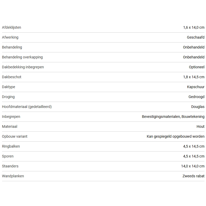 Dit zeer complete Lariks Douglas kapschuur bouwpakket bestaat uit voorgeboorde en voorgezaagde geschaafde staanders, schoren, 4.5 x 12 cm balken, 18 mm dikte veer en groef dakplanken inclusief Nederlandse bouwtekening en bevestigingsmateriaal.
