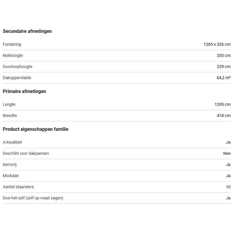 Deze luxe houten kapschuur heeft sterke verbindingen en wordt geleverd met schuine schoren. De voetprint van de staanders van deze fraaie Lariks kapschuur is 1265 x 298 cm. De vrije doorgangsmaat tussen de 10 Lariks staanders van 14 x 14 cm bedraagt 298 cm, zowel aan de voorkant, achterkant en zijkanten.