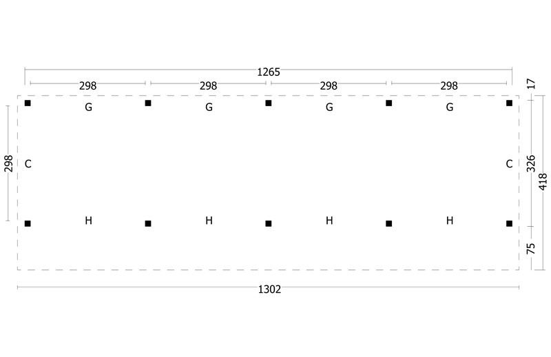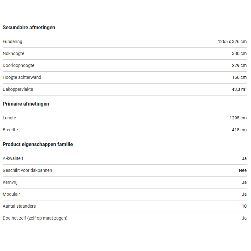 De diepte van deze schitterende Lariks kapschuur Bergen XL type 9 met zadeldak is 4.18 meter, de breedte is 13 meter en de hoogte is 3.3 meter. Deze luxe houten kapschuur heeft sterke verbindingen en wordt geleverd met schuine schoren. De voetprint van de staanders van deze fraaie Lariks kapschuur is 1265 x 298 cm. De vrije doorgangsmaat tussen de 10 Lariks staanders van 14 x 14 cm bedraagd 298 cm, zowel aan de voorkant, achterkant en zijkanten.