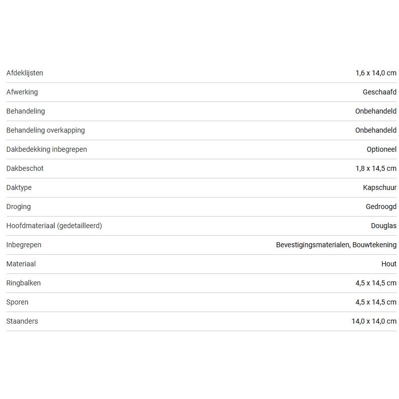 Dit zeer complete Lariks Douglas kapschuur bouwpakket bestaat uit voorgeboorde en voorgezaagde geschaafde staanders, schoren, 4.5 x 12 cm balken, 18 mm dikte veer en groef dakplanken inclusief Nederlandse bouwtekening en bevestigingsmateriaal.