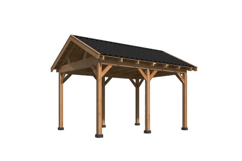 Dit zeer complete Douglas bouwpakket bestaat uit voorgeboorde en voorgezaagde 14.5 x 14.5 cm geschaafde staanders, schoren, 4.5 x 14.5 cm balken, 16 mm dikte veer en groef dakplanken inclusief Nederlandse bouwtekening en bevestigingsmateriaal.