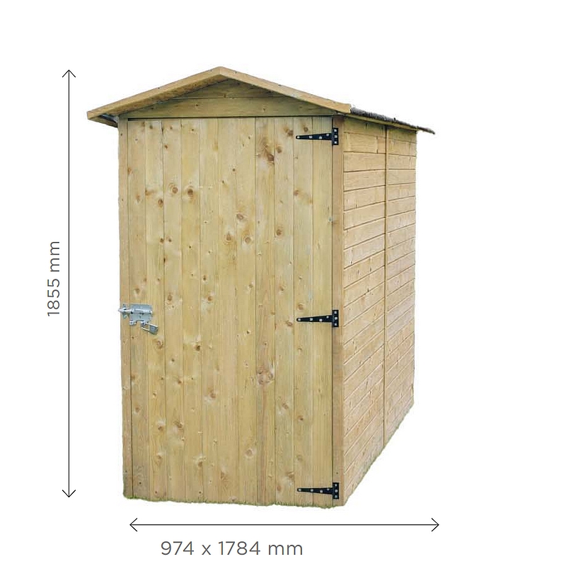 De tuinkast heeft een breedte van 974 mm, een diepte van 1784 mm en een hoogte van 1855 mm. Dit komt neer op een compacte maar bruikbare ruimte met een binnenoppervlakte van 1,59 m².