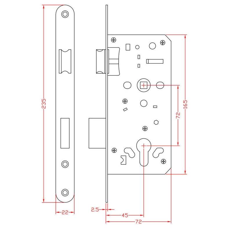 Qua afmetingen is de set ontworpen om compatibel te zijn met de meest gangbare poortafmetingen. De slotkast meet 72 mm breed bij 165 mm hoog. De doornmaat, de afstand van de voorplaat tot het hart van de kruk/cilinder, bedraagt 45 mm, en de PC-maat (steekmaat) – de afstand tussen het hart van de kruk en de cilinder – is 72 mm. De meegeleverde cilinder is doorgaans een standaardmaat van 40x40 mm.
